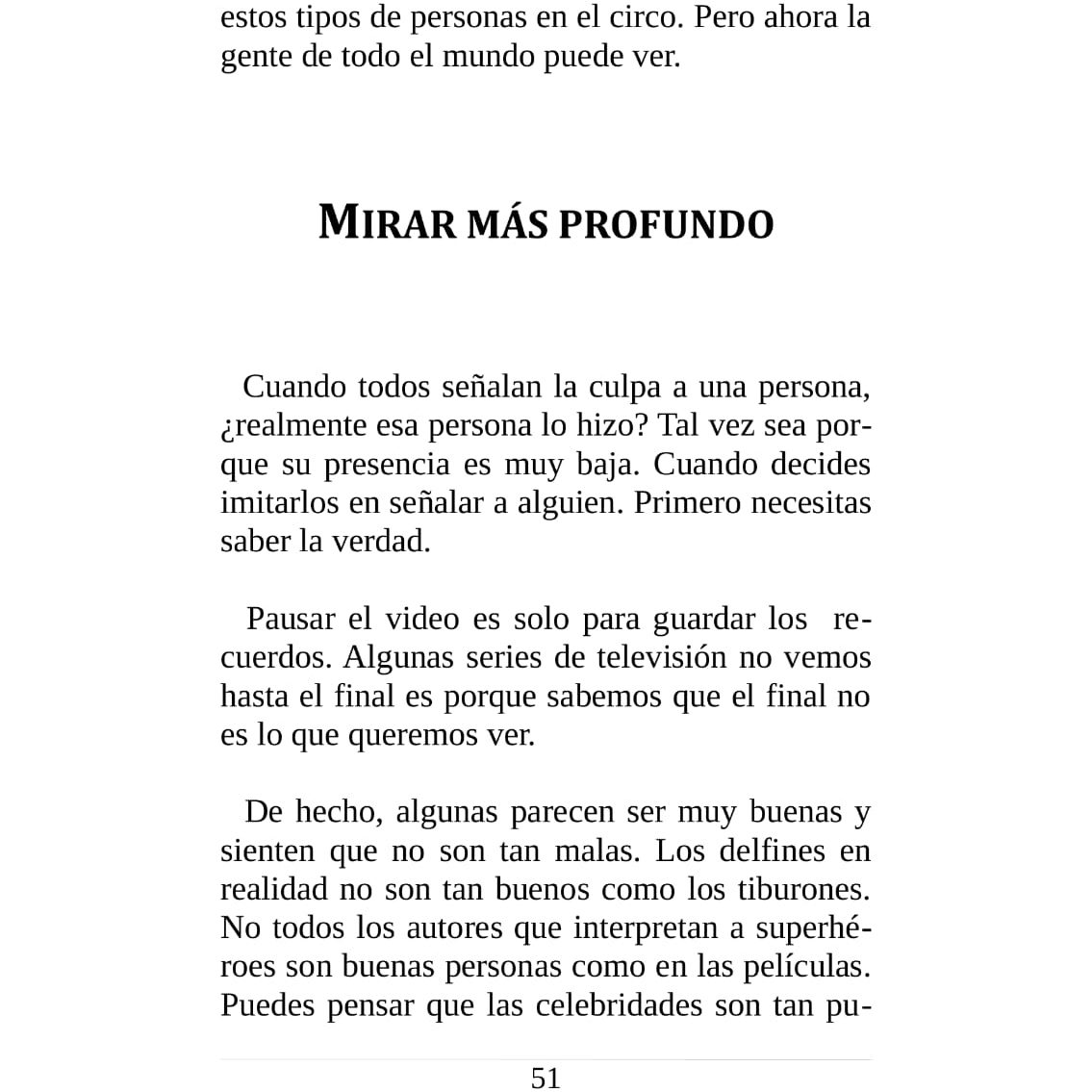 Tiene muchos contenidos. Contiene experiencias y pensamientos de otras personas (como el amor). El objetivo es que puedan saber más sobre este mundo. Espero que mi libro les pueda ayudar.